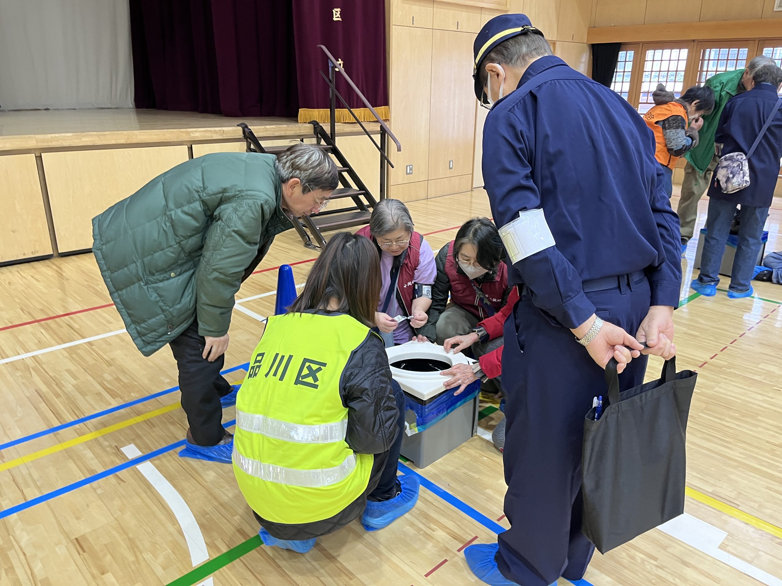 安否確認、物資仕分け訓練、初期消火、煙体験、発電機試運転、町会保有機材の町会、応急救護(AED/心肺蘇生/止血法)と体験や確認作業を品川消防署・消防団の協力の元、スムーズに実施することできました。