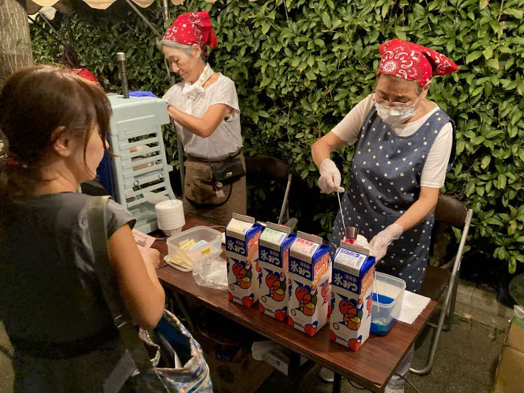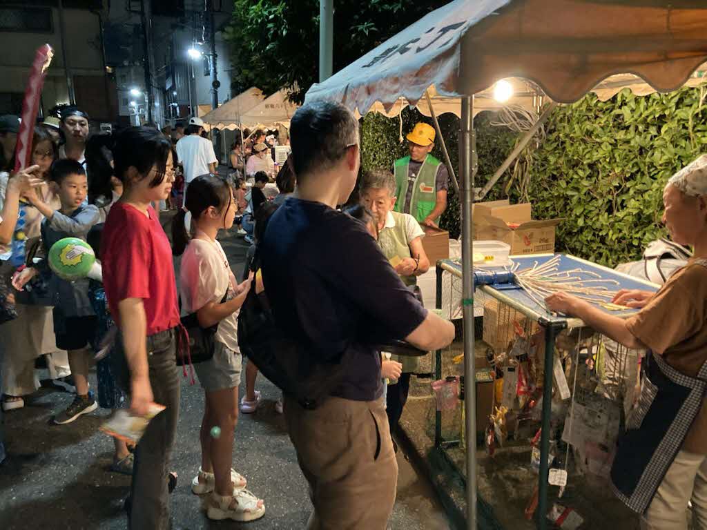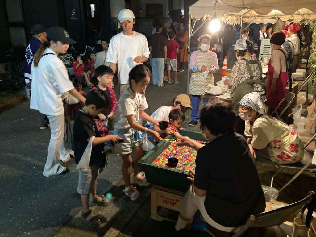 夕方6時、日が暮れて暗くなると会場テントには裸電球が灯り、ノスタルジックな雰囲気。たこ焼きやかき氷などの出店が並びました。特におでんは味が染みていておいしいと好評。ほかにも、スーパーボールすくいや宝釣りゲームも出展、地域の親子連れなどで賑わいました。